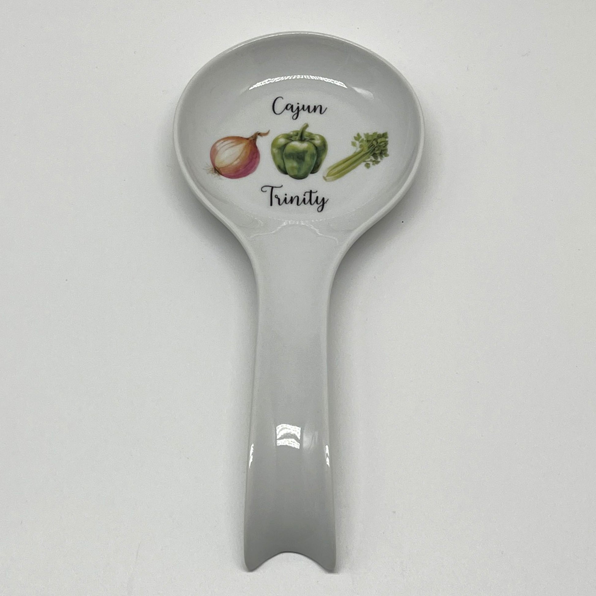 Whether you're cooking a pot of gumbo or favorite dish this Cajun Trinity chef's spoon rest is perfect to keep your countertop clean while sitting down your spoon. This spoon rest is designed with a nice wide bowl area and grooved area to cradle the handle of the utensil. This porcelain spoon rest is 9 1/4" long, 4 1/4" wide at its widest point, and 3/4" high. It is dishwasher safe.